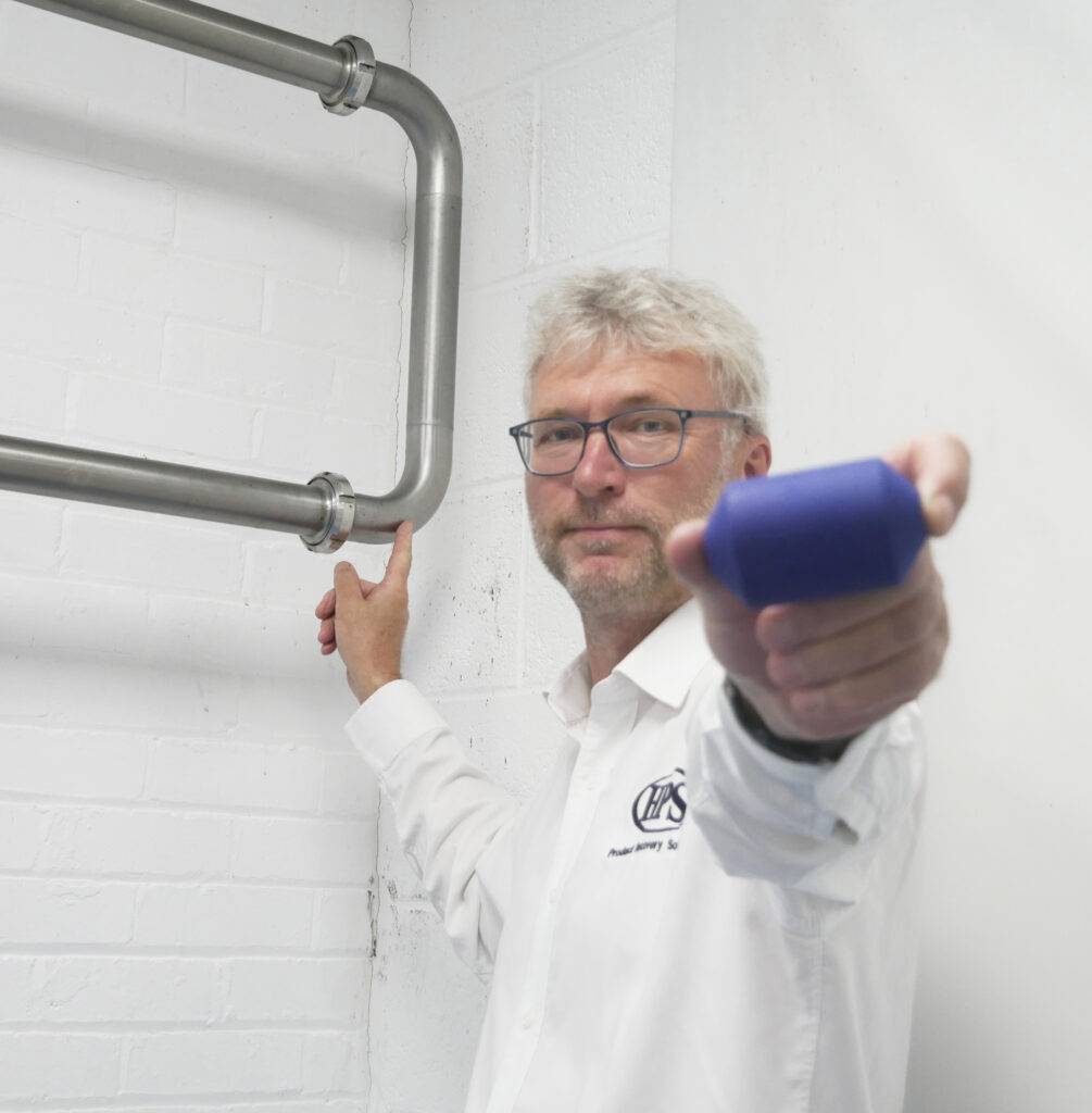 The patented design of the HPS hygienic pig is responsible for the recovery rate being so high – unlike other pigs, the HPS pig doesn’t have a solid magnet in the core but has a magnetised silicone core which enables flexibility, even around 1.5D bends. It also doesn’t have fins or wipers or discs, which means that product isn’t getting caught in the pig itself, and the uniform profile of the pig gives full body contact with the pipeline and prevents product bypass.