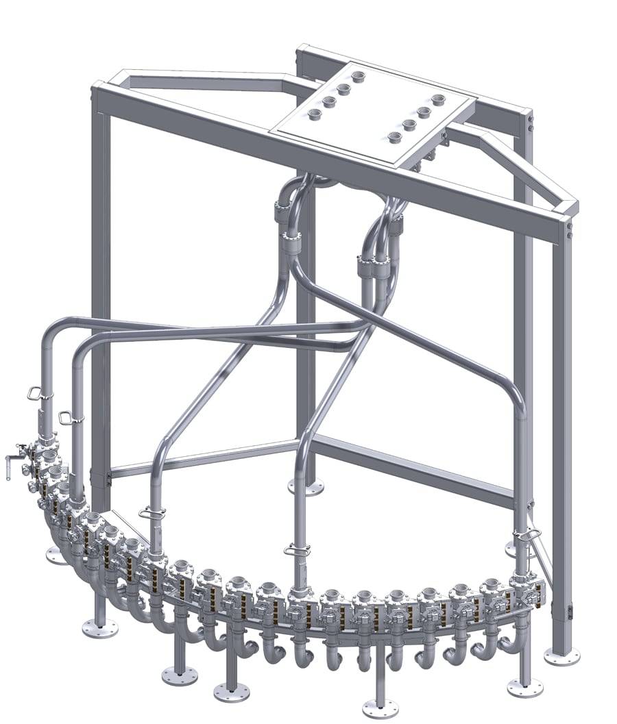 Each arm contains a pig launcher directly after the pump and each destination has a pig receive station and return station. This enables a pig to be sent to and returned from any destination. So, for example, if you have multiple storage tanks, the Rotomatrix enables any of these storage tanks to transfer product to any of the process lines effectively and efficiently.